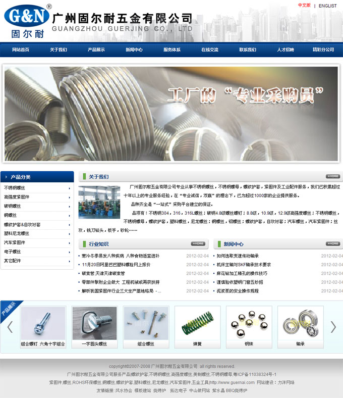 项目名称:广州固而耐五金有限公司网站建设签定日期:2012年2月11日网址:http://www.guernai.com广州固尔耐五金有限公司专业从事不锈钢螺丝,不锈钢螺母,螺纹护套,紧固件及工业配件服务,我们已积累超过十年以上的专业服务经